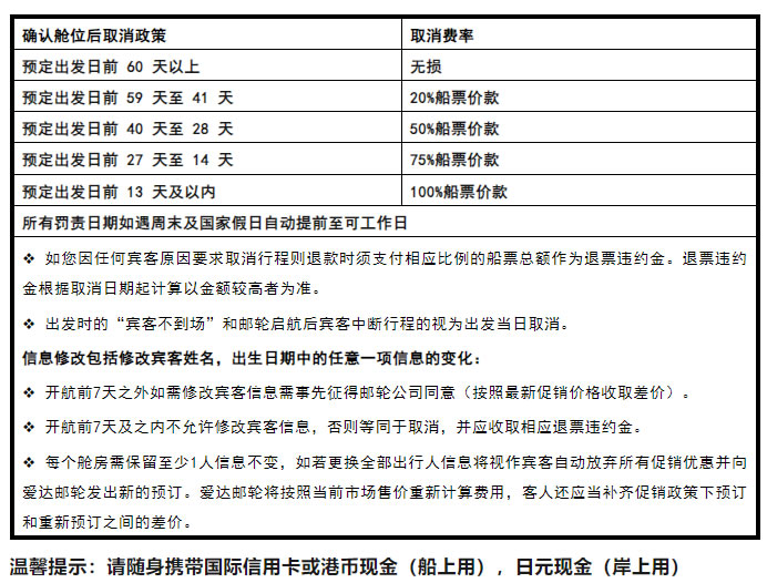 2)我社保留根據具體情況更改行程的權利,以上行程僅供參考,請以出發(fā)登船通知行程為準。離港時(shí)間僅供參考。